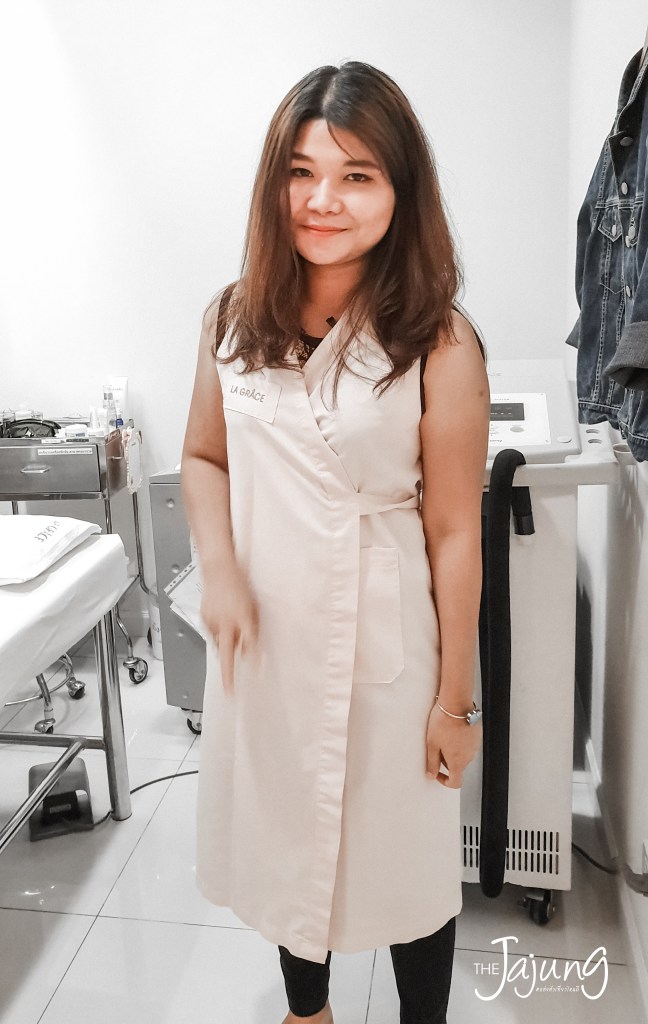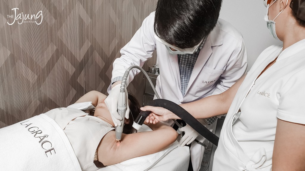 จ๋าก็ได้ลองหาข้อมูลว่าจะมีวิธีไหนที่จะทำให้รักแร้กลับมางามได้อีกในอินเตอร์เน็ต และแล้วก็พบว่าต้องไปเลเซอร์กำจัดขนรักแร้ และเลเซอร์รักแร้ขาว แต่พอเห็นราคาเอา 2 คอร์สนี้มารวมกันแล้วก็หลายบาทอยู่ เลยลองหาดูว่าจะมีเลเซอร์แบบไหนที่ทำแล้วได้ทั้งกำจัดขนและรักแร้ขาวเนียนไปด้วยเลย ก็ไปเจอเพจของ La GRÂCE Clinic ซึ่งทางคลินิกจะใช้ YAG Laser ซึ่งจะช่วยให้ขนหลุดออกทั้งหมด หลังจากนั้นขนใหม่จะขึ้นช้าลงไปเรื่อยๆ เส้นขนที่เกิดใหม่ก็มีขนาดที่เล็กลง สีอ่อนลง และจะค่อยๆ ขึ้นน้อยลง จนหมดไปในที่สุด และข้อดีของเจ้า YAG Laser นี้ จะช่วยให้ผิวเรียบเนียนเกลี้ยงเกลาขึ้นอีกด้วย และที่นี่ La GRÂCE Clinic คุณหมอจะเป็นคนทำเลเซอร์ให้ทุกเคสค่ะ จ๋าก็เลยตัดสินใจเลือกมาที่นี่