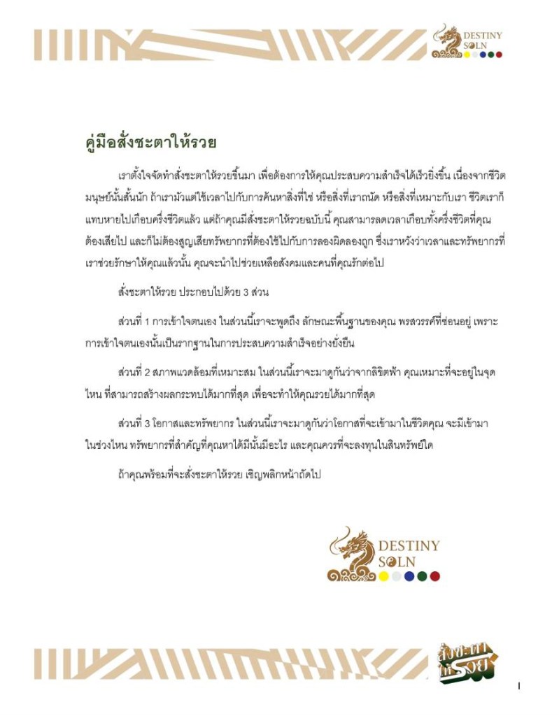 สำหรับเพื่อนๆ ที่ตอนนี้กำลังคิดไม่ตก ว่าจริงๆ แล้วฉันชอบอะไร หาตัวตนของตัวเองยังไม่เจอ ก็ลองเปิดใจหาตัวช่วยอย่างคู่มือ “สั่งชะตาให้รวย” ดูนะคะ สามารถเข้าไปดูได้ที่ Facebook : https://www.facebook.com/destinysoln/