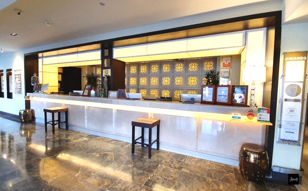 พอมาถึงที่ที่โรงแรมเราก็ทำการ check in ให้เรียบร้อย จากนั้นพนักงานจะนำ Welcome Drink มาให้เราก่อนที่จะขึ้นไปห้องพัก ซึ่งรสชาติจะคล้ายๆ น้ำใบเตยผสมตะไคร้ แต่ดื่มไปก็รู้สึกสดชื่นดีนะคะ พอนั่งพักเรียบร้อยแล้วก็จะมีพนักงานช่วยเราถือกระเป๋าแล้วพาเราไปที่ห้องพักกันค่ะ