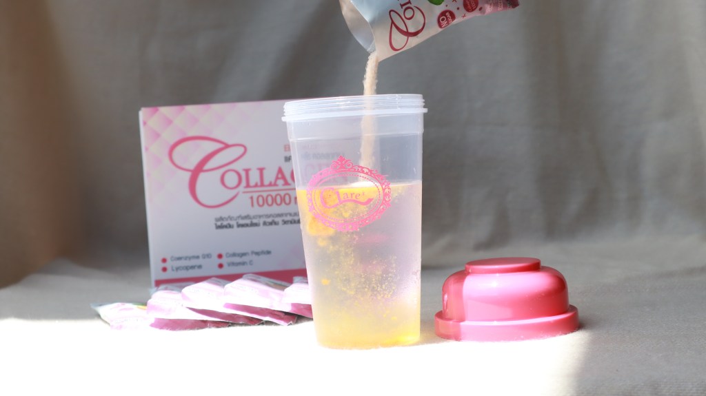 เราชง Clare’s Collagen 1 ซอง กับน้ำเย็น ดื่มทุกเช้าตอนท้องว่าง พร้อมวิตามินซี 1 เม็ด เพราะทานคู่กับวิตามินซี คอลลาเจนจะดูดซึมได้ดียิ่งขึ้น