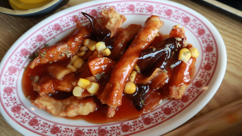 ทังซูยุค หมูชุบแป้งทอดผัดเปรี้ยวหวาน รสชาติเปรี้ยวนำ หวาน รสชาติจัดจ้าน อร่อยกลมกล่อม หมูชุบแป้งทอดเนื้อหมูนุ่ม ไม่เหนียว จากร้าน Mu Gung Banjeom (มู กุง บันจอม) ร้านอาหารเกาหลีผสมผสานสไตล์จีนตามสูตรต้นตำรับโบราณ อาหารสไตล์ฟิวชั่น ราคา 89 บาท