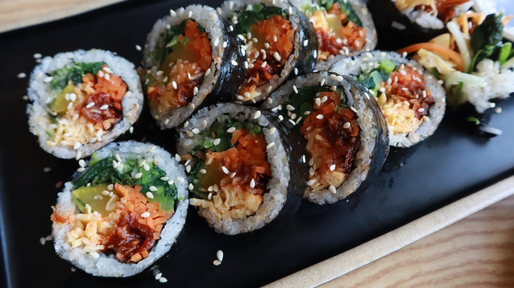 กิมบับโอเด้งเผ็ด ข้าวห่อสาหร่ายเกาหลี ไส้โอเด้งเผ็ด ชิ้นใหญ่เต็มคำ จากร้าน Manda Gimbap (มันดา กิมบับ) เป็นร้านอาหารเกาหลีทางเลือกสำหรับคนรักสุขภาพ และมีเมนูเพื่อสุขภาพอย่าง โปซองคิมบับ ซึ่งเป็นคิมบับไร้ข้าว อัดแน่นด้วยปูอัดอลาสก้าคุณภาพเยี่ยมและไส้ต่างๆ ราคา 139 บาท