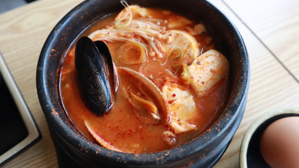 ซีฟู้ดซุนดูบู ซุปเต้าหู้อ่อนน้ำซุปซีฟู้ดมีหอยแมลงภู่ เห็ดเข็มทอง รสชาติกลมกล่อม ไม่เผ็ดมาก สำหรับคนรักสุขภาพก็สามารถทานได้ด้วย จากร้าน Namchon Soft Tofu (นัมชอน ซอฟ โทฟู) ราคา 199 บาท