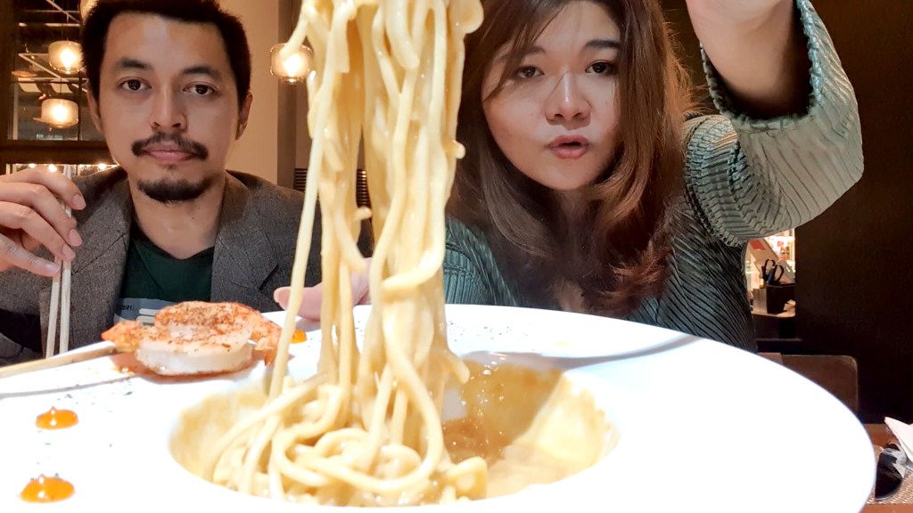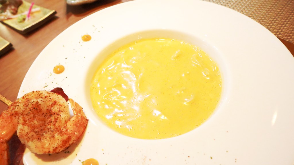 ราเมงอาหารญี่ปุ่นสุดฮิต แต่จานนี้ไม่เหมือนที่อื่น ตัวเส้นเหนียวนุ่มกำลังดี เสิร์ฟมากับซุปราเมงที่อยู่ชั้นล่างและมีโฟมล็อบสเตอร์ราดอยู่ด้านบน ยังกุ้งย่างพริกอีกสองตัว มี Chilli Oil ให้ทานคู่กันเพื่อเพิ่มรสชาติ และ ตัดเลี่ยน เชฟบอกว่าแนะนำให้ชิมตัวซุปด้านบนก่อน แล้วคนซุปส่วนที่เป็นน้ำสต็อคและโฟมล็อบสเตอร์ให้เข้ากันก่อนทาน รสชาตินุ่มนวล กลมกล่อม หอมกลิ่นโฟมล็อบสเตอร์ เมนูนี้ก็ฟินมากๆ เช่นกัน จะเสิร์ฟมาให้ 1 ที่ค่ะ