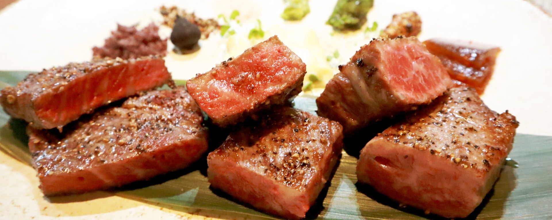 เมนูนี้จะเสิร์ฟเครื่องเคียงมาให้ 9 แบบ เพื่อเพิ่มรสชาติของเนื้อ ซึ่งในการทานเนื้อคำแรกทางเชฟแนะนำให้ทานเนื้อเปล่าๆ อย่าพึ่งจิ้มอะไรเลย เพื่อให้เราได้สัมผัสรสชาติของเนื้อแท้ๆ ซึ่งอร่อยเลย ไม่ต้องจิ้มก็ได้ จากนั้นก็ทดลองเครื่องเคียงที่ให้มาทีละอย่าง จะเสิร์ฟมาให้ 1 ที่ค่ะ