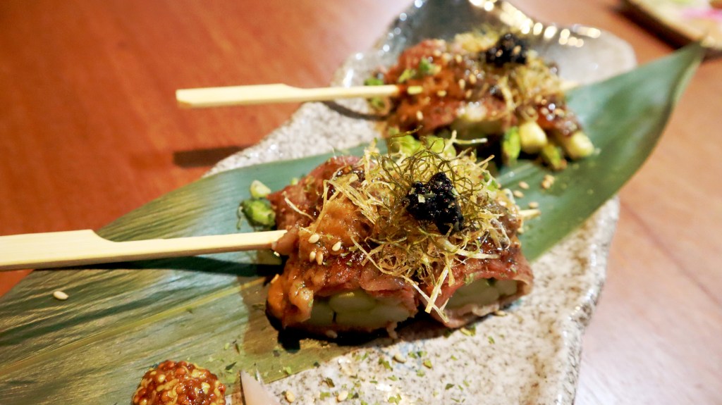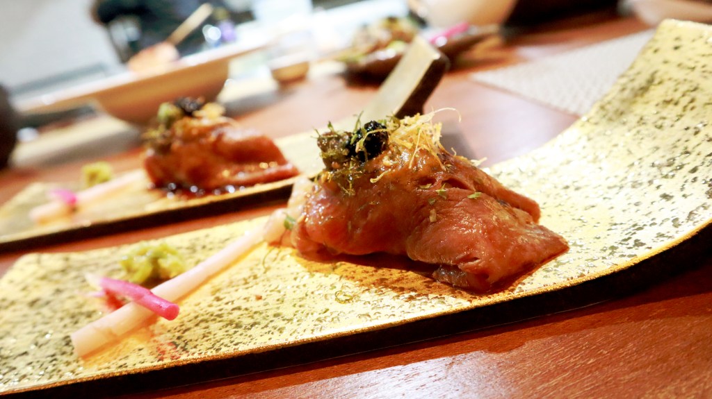 อาหารเรียกน้ำย่อยเมนูที่ 2 เป็น วากิวซูชิ (Sushi Wagyu) ซึ่งเมนูนี้จะเสิร์ฟให้ 2 คำ ซูชิที่ถูกวางทับด้วยเนื้อวากิวแผ่นโตๆ พร้อมซอสซอสฟัวกราส์ ด้านบนเป็นหอมทอดและคาเวียร์ รสชาติคือสวรรค์เลย เนื้อวากิวละลายในปาก