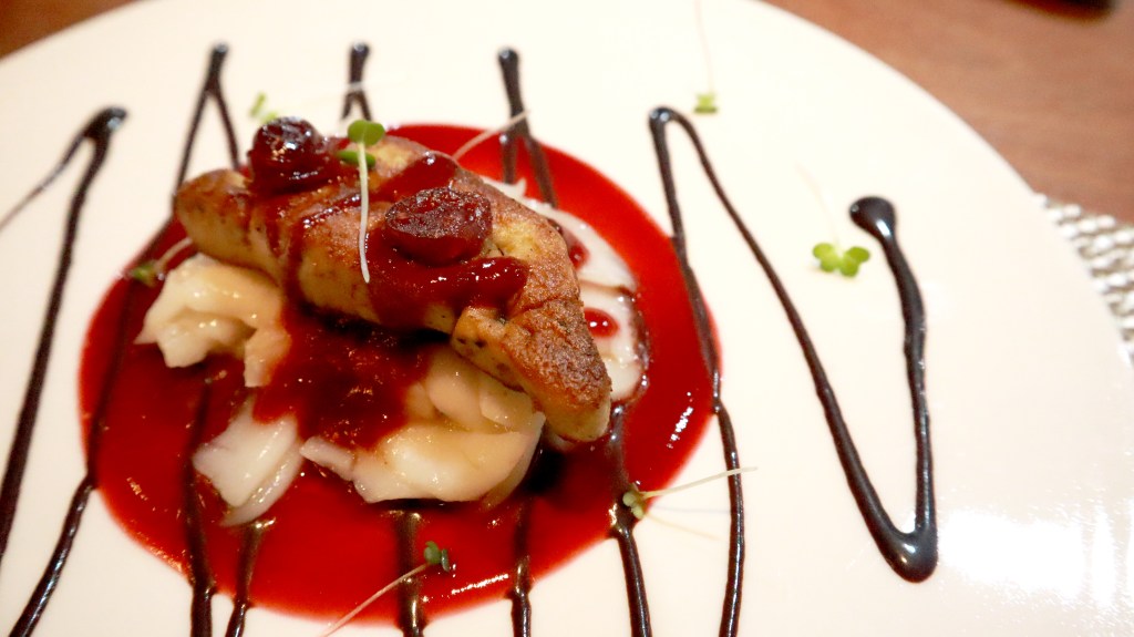 อาหารเรียกน้ำย่อยเมนูที่ 5 ฟัวกราส์ โคโคนัท คาราเมล (Foie Gras Coconut Caramel) เมนูนี้ทางร้านบอกว่าเป็นเมนูแนะนำเลยค่ะ ตับห่านชิ้นโตที่เสิร์ฟคู่กับเนื้อมะพร้าวอ่อน ราดซอสราสเบอร์รี่และช็อคโกแลต ทำให้ของคาวกับของหวานมารวมตัวกันและได้รสชาติหวานๆ เปรี้ยว กลมกล่อมและลงตัวมากๆ เลยค่ะ ตับห่านก็ไม่คาว สมแล้วที่เป็นเมนูแนะนำ จะเสิร์ฟมาให้ 1 ที่ค่ะ