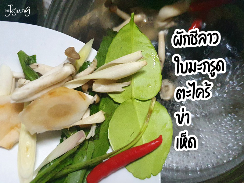 จากนั้นใส่ผักชีลาว ใบมะกรูด ตะไคร้ ข่า และเห็ด ลงไปในหม้อ