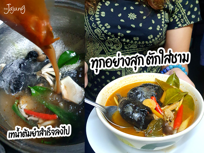 เทเครื่องต้มยำสำเร็จลงในหม้อ ต้มต่อสักพักจนทุกอย่างสุกดี ตักขึ้นใส่ชาม